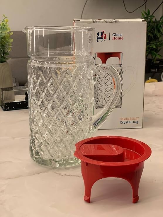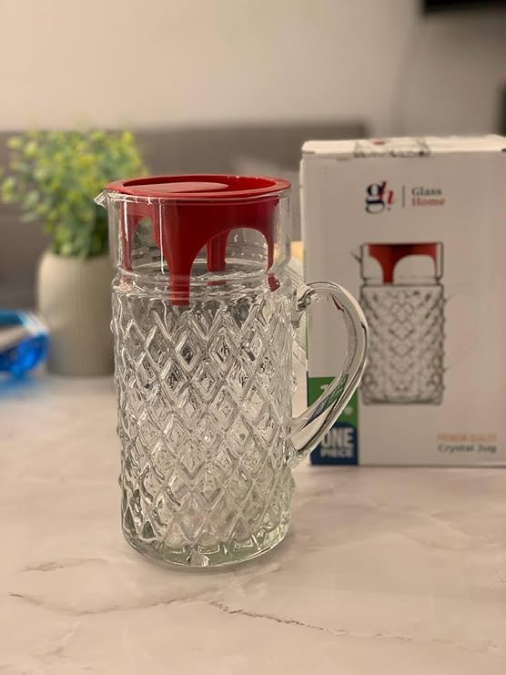 ضيفي لمسة فخامة على سفرتك مع الإبريق الزجاجي الماسي الأنيق بغطائه الأحمر العصري.