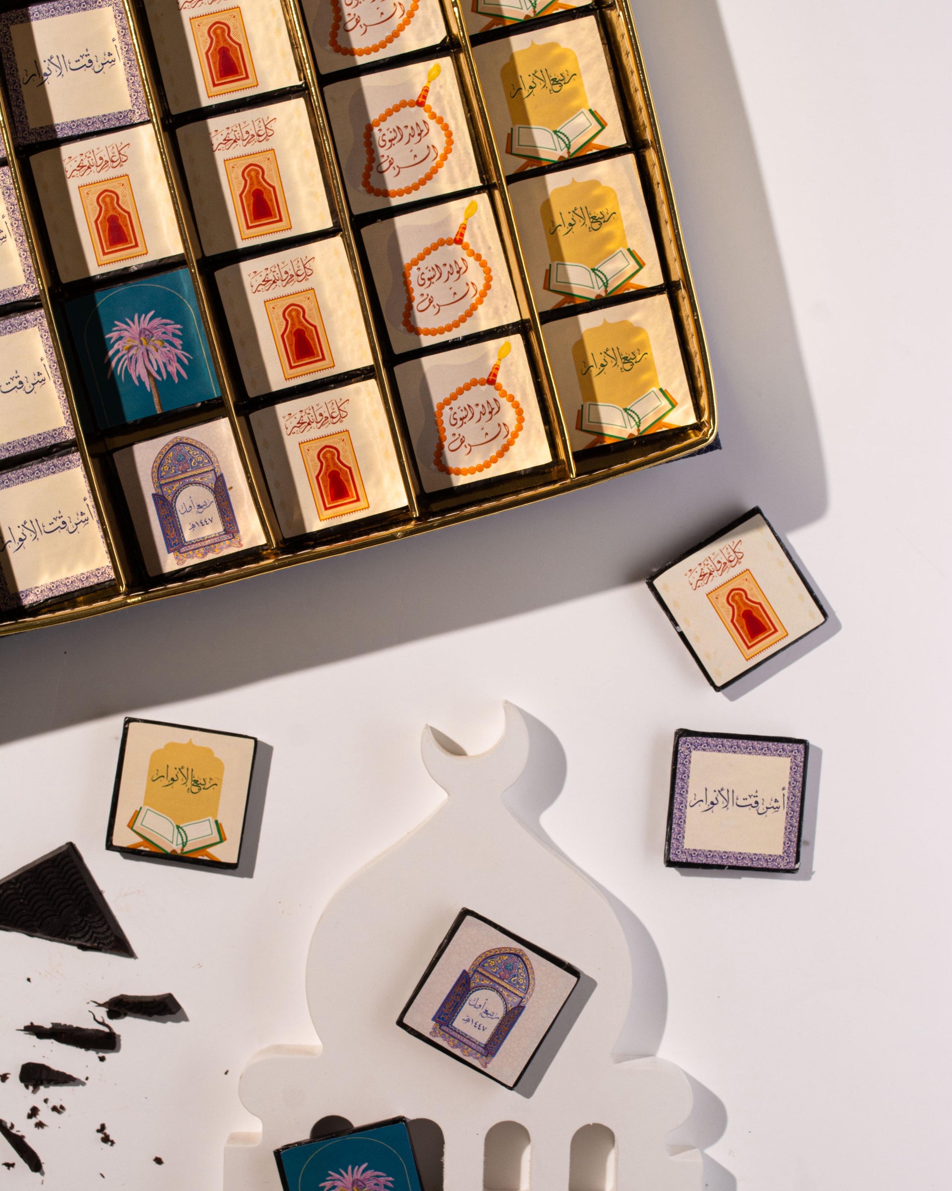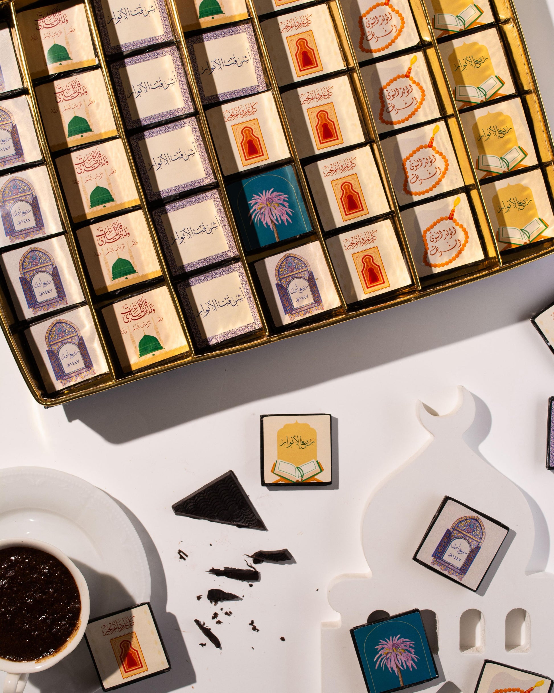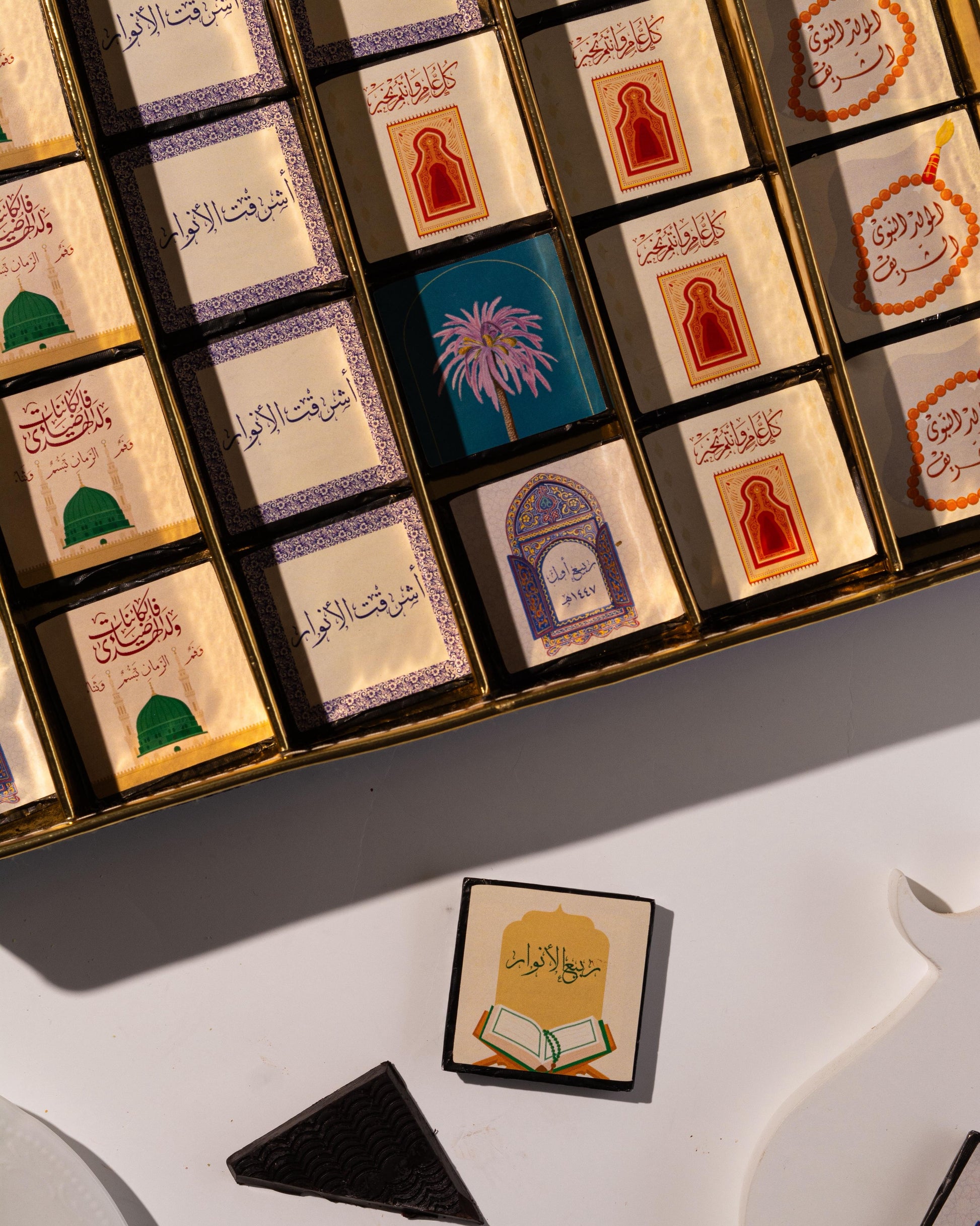 "تشكيلة شوكولاتة فاخرة بطابع إسلامي مميز، مزينة برسومات وزخارف مستوحاة من التراث النبوي احتفالًا بالمولد الشريف، لتجمع بين الطعم اللذيذ وروح المناسبة العطرة."