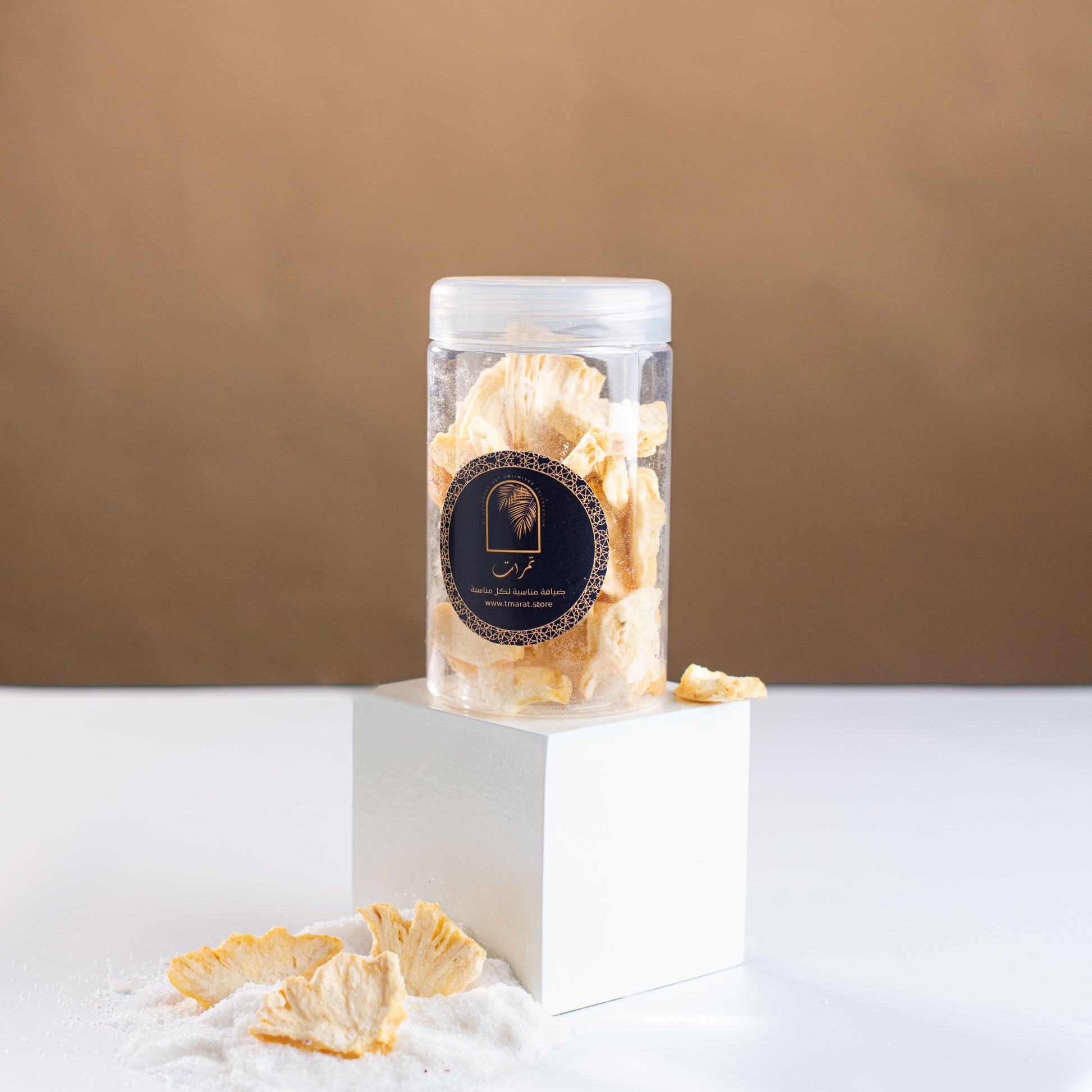 “أناناس مقرمش مجفف بالتبريد من تمرات – مزيج مثالي من النكهة الاستوائية المنعشة والقوام المقرمش الشهي. يتم تجفيف الأناناس باستخدام تقنية التجفيف بالتبريد للحفاظ على العناصر الغذائية والطعم الطبيعي دون أي إضافات صناعية. خيار صحي وممتع لجميع الأوقات!”