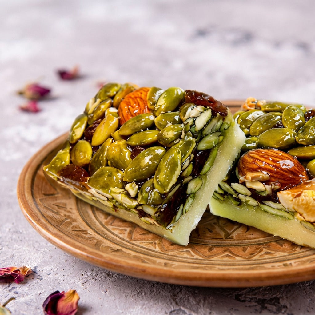 A balanced blend of coconut, pumpkin seeds, almonds, and red malban pieces, offering a delightful mix of textures and a lightly sweet taste.