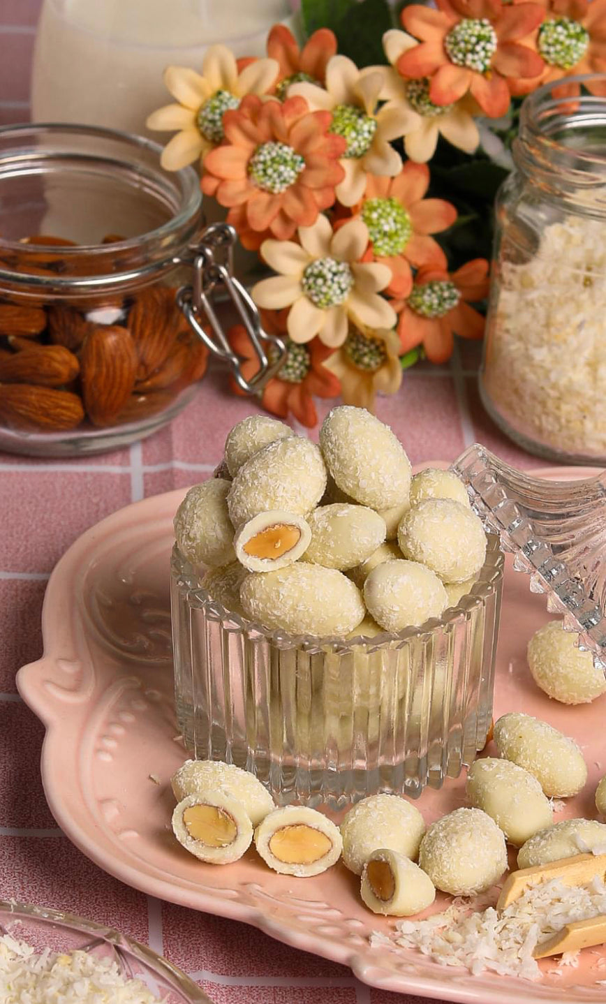 اللوز الطازج يضفي قيمة غذائية عالية، مُغطى بطبقة من الشوكولاتة البيضاء الفاخرة قليلة السكر، ثم طبقة مقرمشة من جوز الهند اللذيذ😋