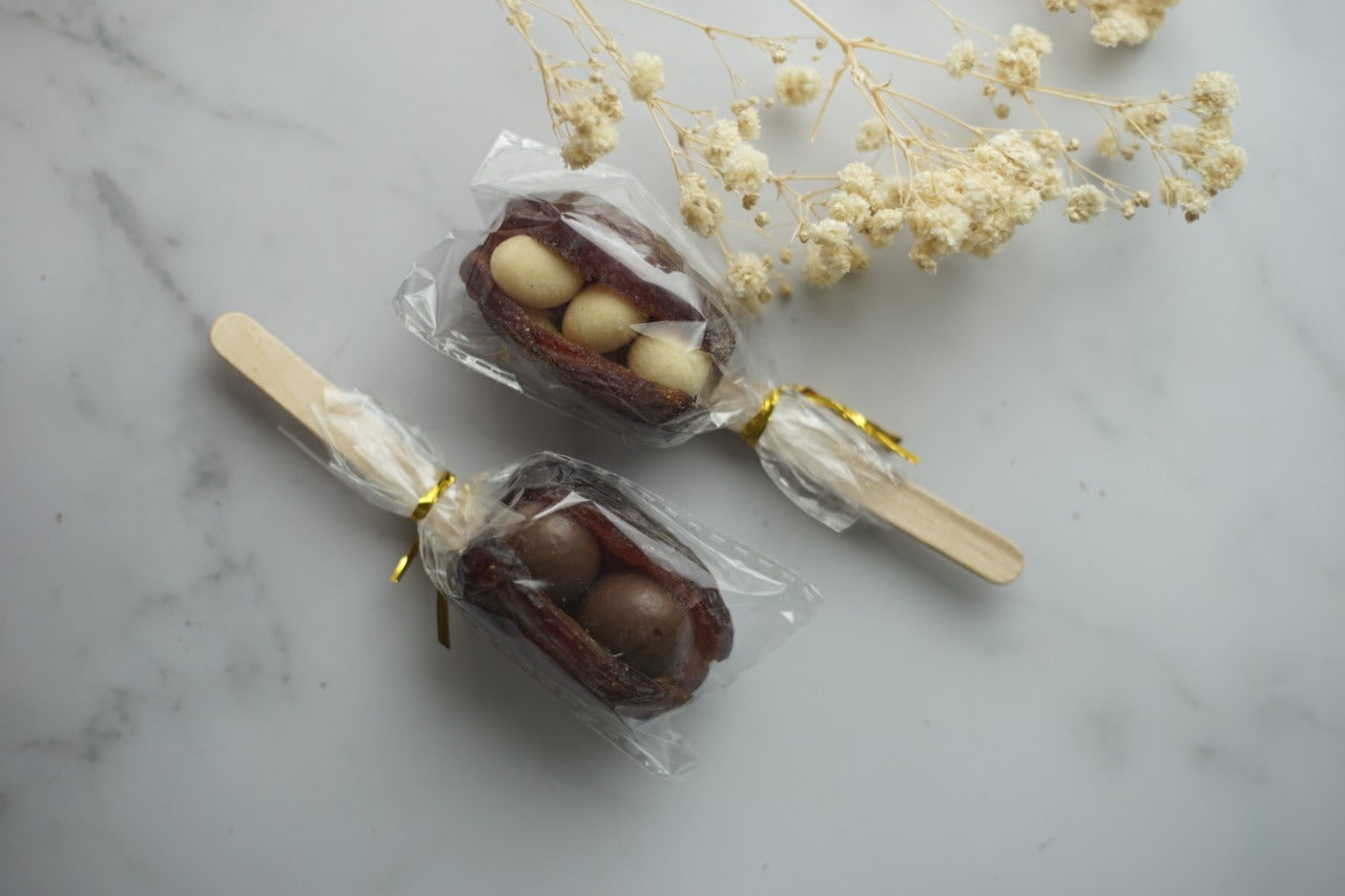 Nutjool Sticks are presented on elegant wooden sticks, carefully wrapped inside transparent Suraye bags, beautifully secured with a thin silk ribbon. This sophisticated packaging provides a premium unboxing experience perfect for unique gifts or special event favors. The elegant wrapping preserves freshness while highlighting the product’s aesthetic appeal, making it an ideal choice for those seeking authenticity and refined taste on every occasion.